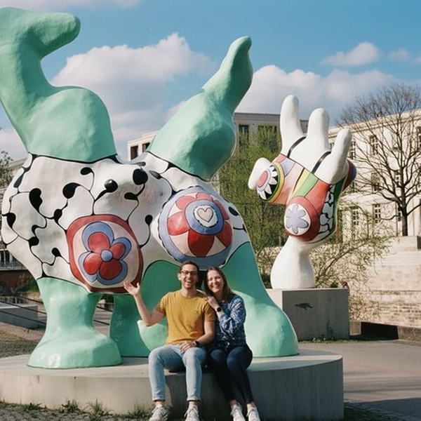 Bewundern Sie das Technicolor-Trio von Niki DE Saint Phalle, einst skandalös, heute beliebt – überschwängliche Ikonen der Weiblichkeit und des bürgerlichen Vertrauens, die am Flussufer schweben.