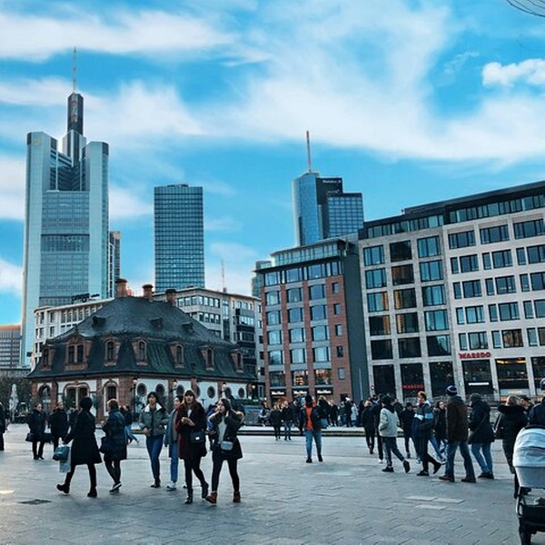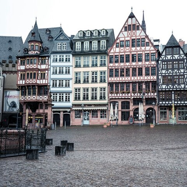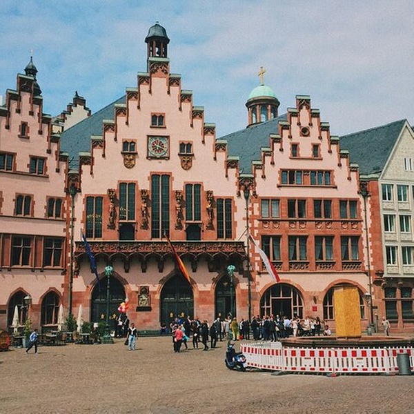 Beginnen Sie am Römer, Frankfurts ikonischem mittelalterlichen Gebäude. Erkunden Sie den umliegenden Römerberg mit seinen charmanten Fachwerkhäusern