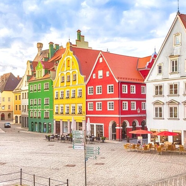 Das Herz von Memmingen, umgeben von bunten historischen Gebäuden und lebendigen Cafés.