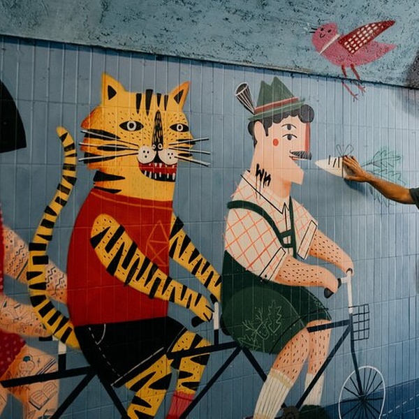 Zwei Superlative nebeneinander : Dieses Jugendstil-Badehaus war bei IT Eröffnung das größte der Welt. Gleich daneben sehen wir das wohl längste Tandemfahrrad der Welt – ein Streetart-Meisterwerk der Künstlerin Miriam Frank.
