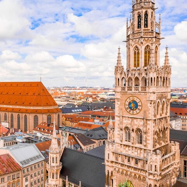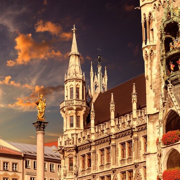 Marienplatz, Herz der Altstadt in München mit imposanter Architektur des neuen Rathauses, dem Sitz des Oberbürgermeisters, wo man unbedingt mal um die Mittagszeit (12 Uhr) einem der größten europäischen Glockenspiele lauschen sollte. In der Mitte des zentralen Platzes steht die historische Mariensäule und Richtung Osten sieht man den bekannten Fischbrunnen und weiter dahinter das repräsentative Alte Rathaus mit dem Spielzeugmuseum und der bezaubernden Julia-Capulet- Statue. In östliche Richtung vom Rathaus aus, sieht man am Rande zwischen den Gebäuden des Marienplatzes eine der berühmtesten Aussichtsplattformen Münchens, den Kirchturm der ältesten Pfarrkirche Münchens Sankt Peter, den man auch den Alten Peter nennt. Aber Achtung: 300 Stufen gilt es zu Fuß zu erklimmen, aber der Ausblick entlohnt für alle Anstrengung.