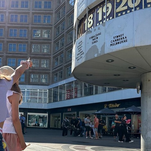 - Sie starten an der Weltzeituhr am Alexanderplatz. Die Uhr ist ein hoher Metallturm mit einer runden Weltkarte und rotierenden Zeitzonen. Es befindet sich im zentralen Bereich des Alexanderplatzes und ist gut sichtbar.