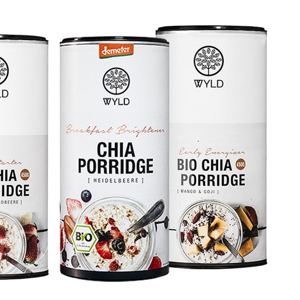 - Lieferumfang: 1x Demeter Chia Porridge Heidelbeeren ‘‘Breakfast Brightener’’ (450 g), 1x WYLD Chia Porridge Mango Goji (450 g), 1x WYLD Chia Porridge Schoko Banane (450 g), 1x WYLD Chia Porridge Crunchy Erdbeeren (450 g)