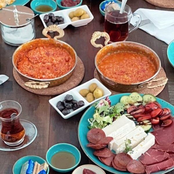 Menemen | Tomaten | Gurken | Salat | Oliven Honig | Marmelade | Schafskäse | Kaymak | Sucuk angebraten | Pastirma (Rinder-Bacon nach türkischer Art) | Nutella | 1 Simit | 2 Brötchen | 2 Croissants | 2 Tee (Teebeutel)