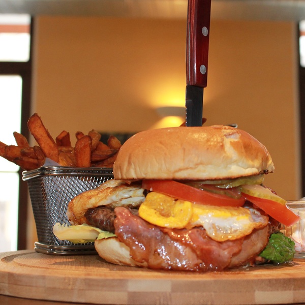 Aus reichlich belegten Burgerkompositionen wählen, dazu knusprige Pommes frites und ein kühles Bier genießen