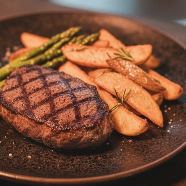 - 2. Gang: Steakplatte mit 200 g Entrecôte, grünem Spargel & knusprigen Kartoffelecken
