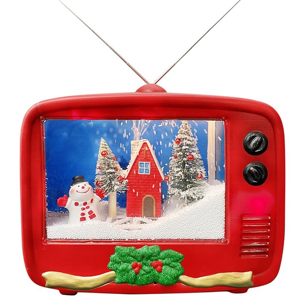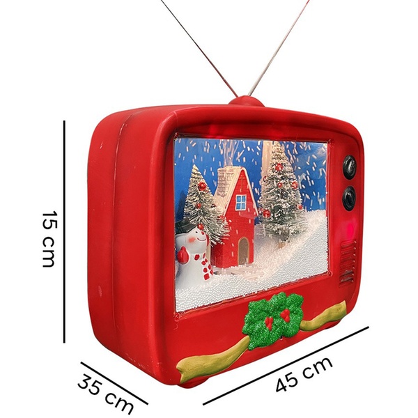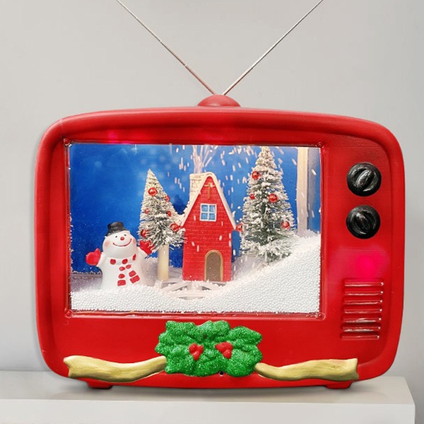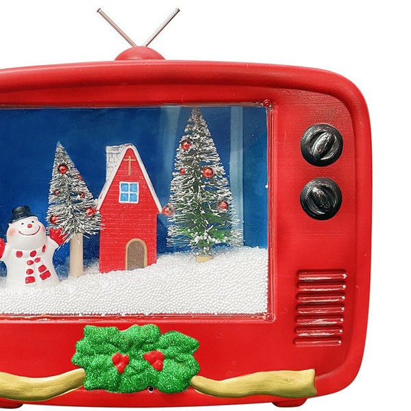 Der Weihnachts-Fernseher in leuchtendem Rot zeigt eine bewegte Schneeszene mit Haus, Schneemann und geschmückten Bäumen und sorgt durch Licht und Musik für festliche Stimmung in jedem Raum