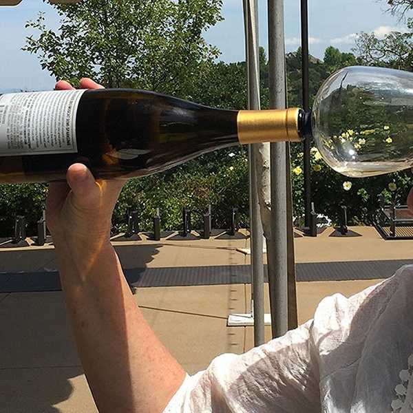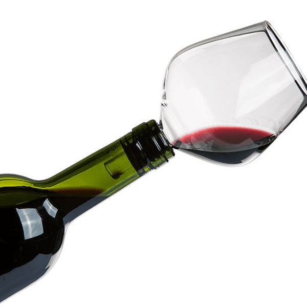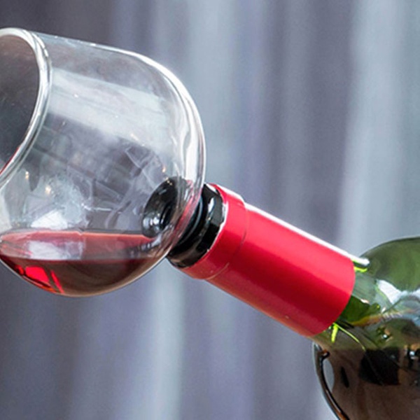 Mit diesem widerstandsfähigen Weinglas ohne Fuß kann man den Wein gleich aus der Flasche trinken