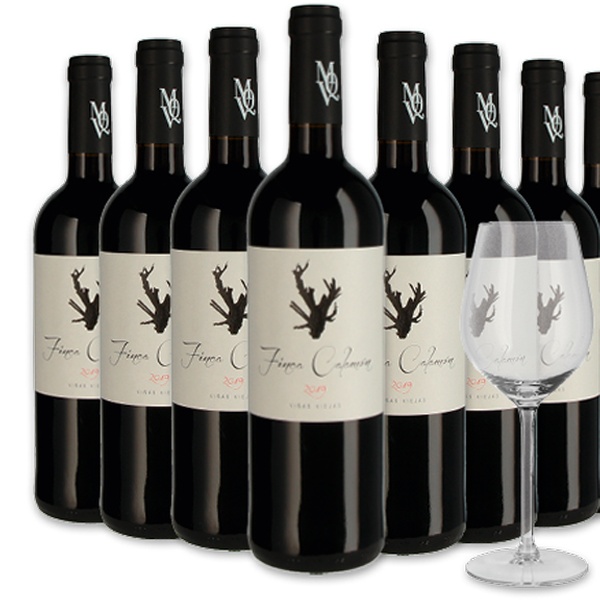 Spanisches Weinpaket mit acht Flaschen Rotwein „Finca Calamon“ aus der La-Mancha-Region und vier passenden Weingläsern
