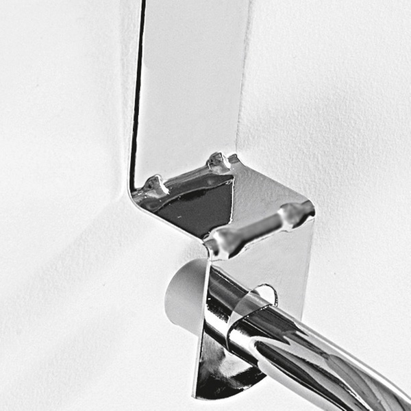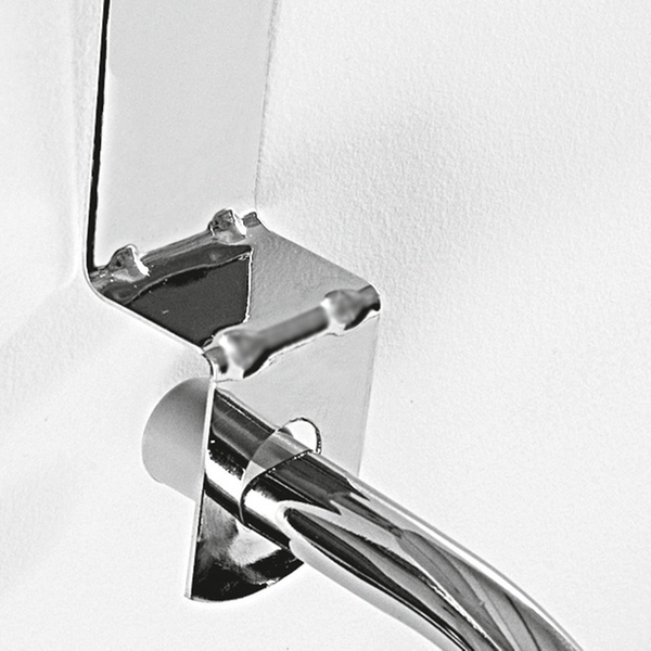 - Das obere Endstück des Hakens wird einfach an der perforierten Sollbruchstelle abgebogen und in die vorgebohrten Löcher eingeschraubt
