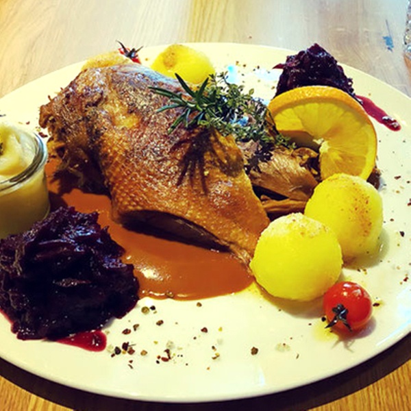 Kartoffelklöße, Gänsejus, saftiger Rotkohl oder Rosenkohl