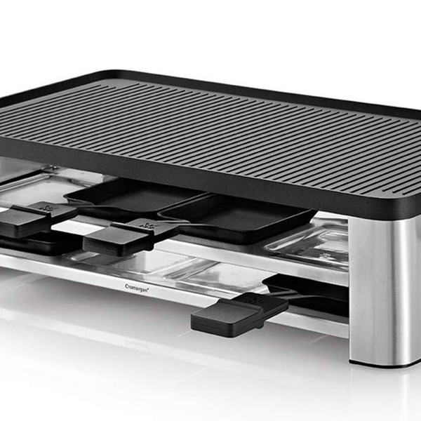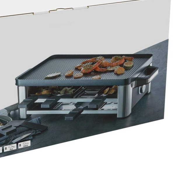 Raclette-Grill mit Wende-Gussplatte, 8 Pfännchen, 8 Kunststoff-Schiebern, praktischer Ablage sowie variabler Temperatureinstellung