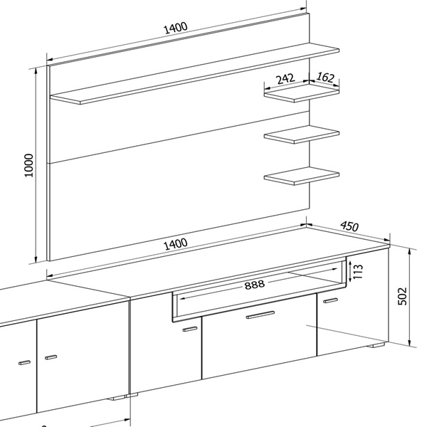 - Set besteht aus zwei niedrigen Modulen, einer oberen Platte mit Regalen und niedrigen Modul mit elektrischem Kamin