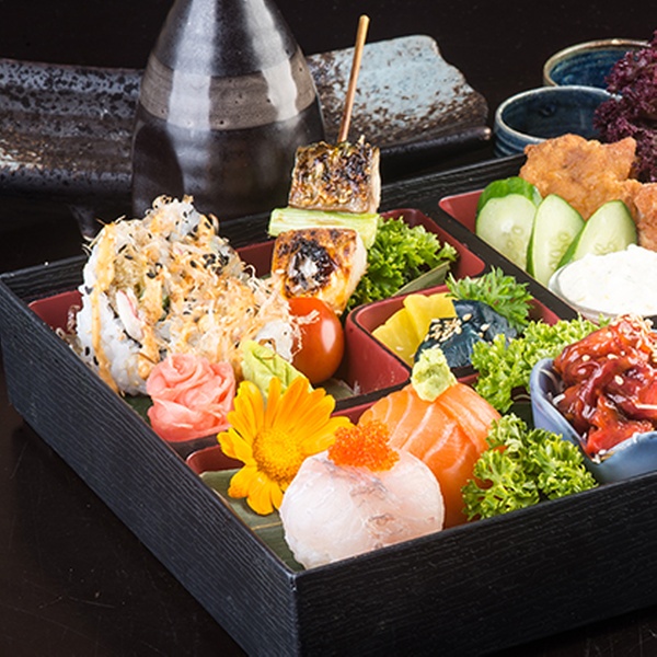 - 4. Gang: Hauptspeise mit 3 Yinshi Delikatessen in Bentobox (zartes Rinderfilet gebraten mit Zwiebeln und Karotten, knusprige Ente auf Sojasprossen mit süß-saurem Dip, Pak Choi gebraten mit Knoblauch in Austernsoße)