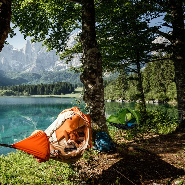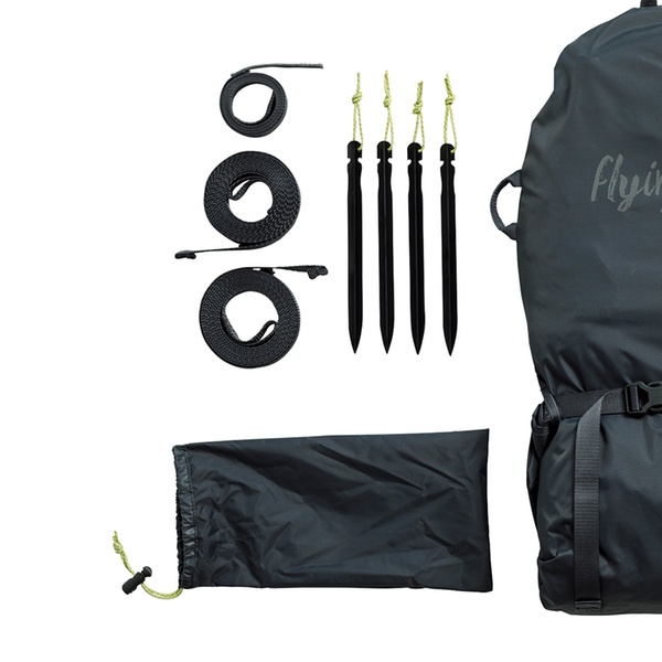 - Zubehör: 4 Zeltstöpsel, 2 Karabiner, 2 Baumgurte, 2 Gürtelschnallen
