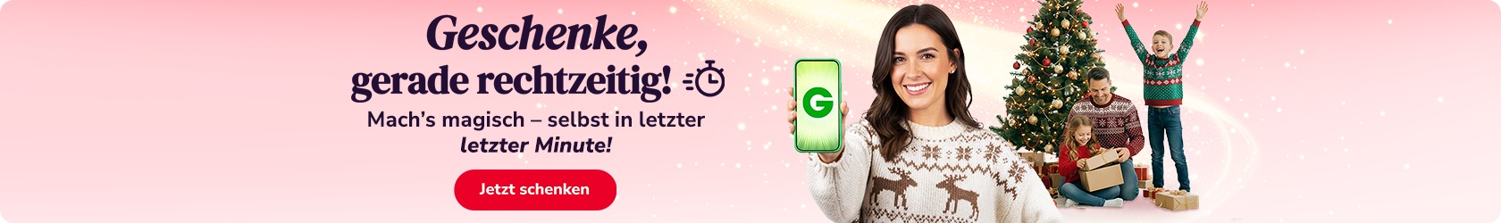 Weihnachtsgeschenke auf den letzten Drücker? Kein Problem — Groupon hat dich abgesichert. Entdecke digitale Geschenke mit Sofortzustellung, die trotzdem perfekt durchdacht wirken, selbst wenn du jetzt erst einkaufst. Von Spa-Erlebnissen und entspannenden Massagen, über Abenteuer-Tagesausflüge, bis hin zu festlichen Dinner-Erlebnissen — verschenke ein tolles Geschenk in wenigen Sekunden direkt ins Postfach des Empfängers.